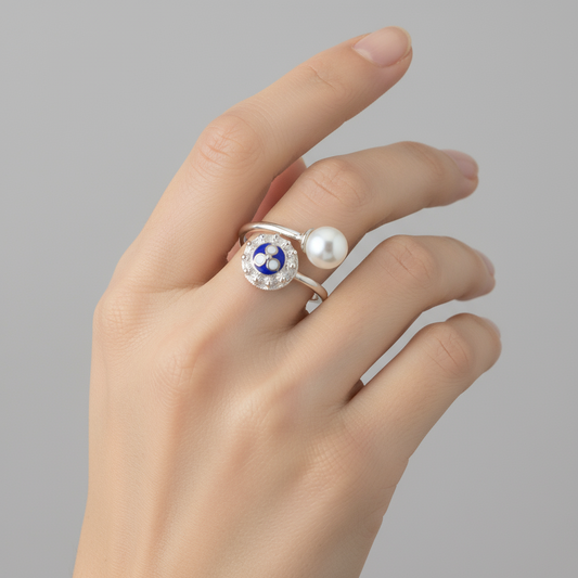 Enamel Flower Ring with Pearl [Silver] - Caramujo